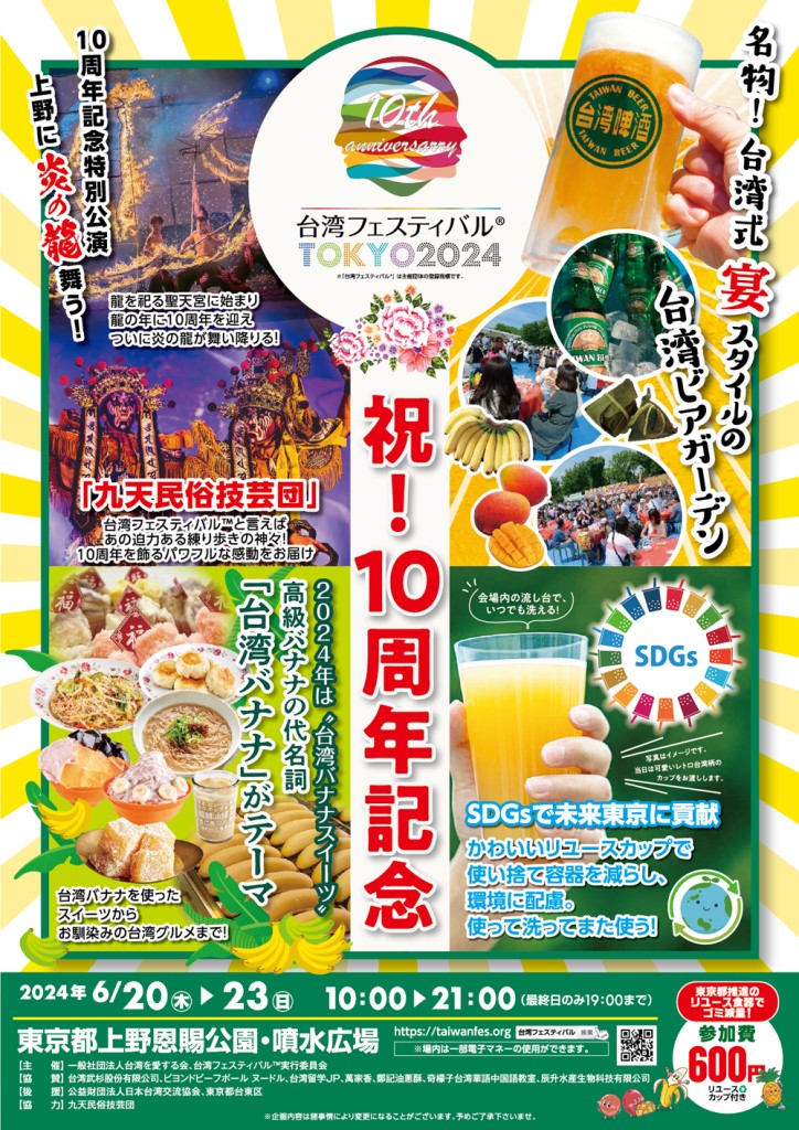 明日の2024年6月20日(木)~23日(日) 上野恩賜公園 噴水広場では「 台湾フェスティバル TOKYO 2024 」が開催されます。今年で10周年を迎える台湾をテーマにしたお祭りで、台湾式「宴」スタイルの台湾ビアガーデンや、台湾バナナを使ったスイーツや台湾グルメ、台湾の伝統パフォーマンス「10周年記念特別公演、上野に炎の龍舞う!」等が楽しめます♪ 私も毎年、楽しみにしているイベントです!